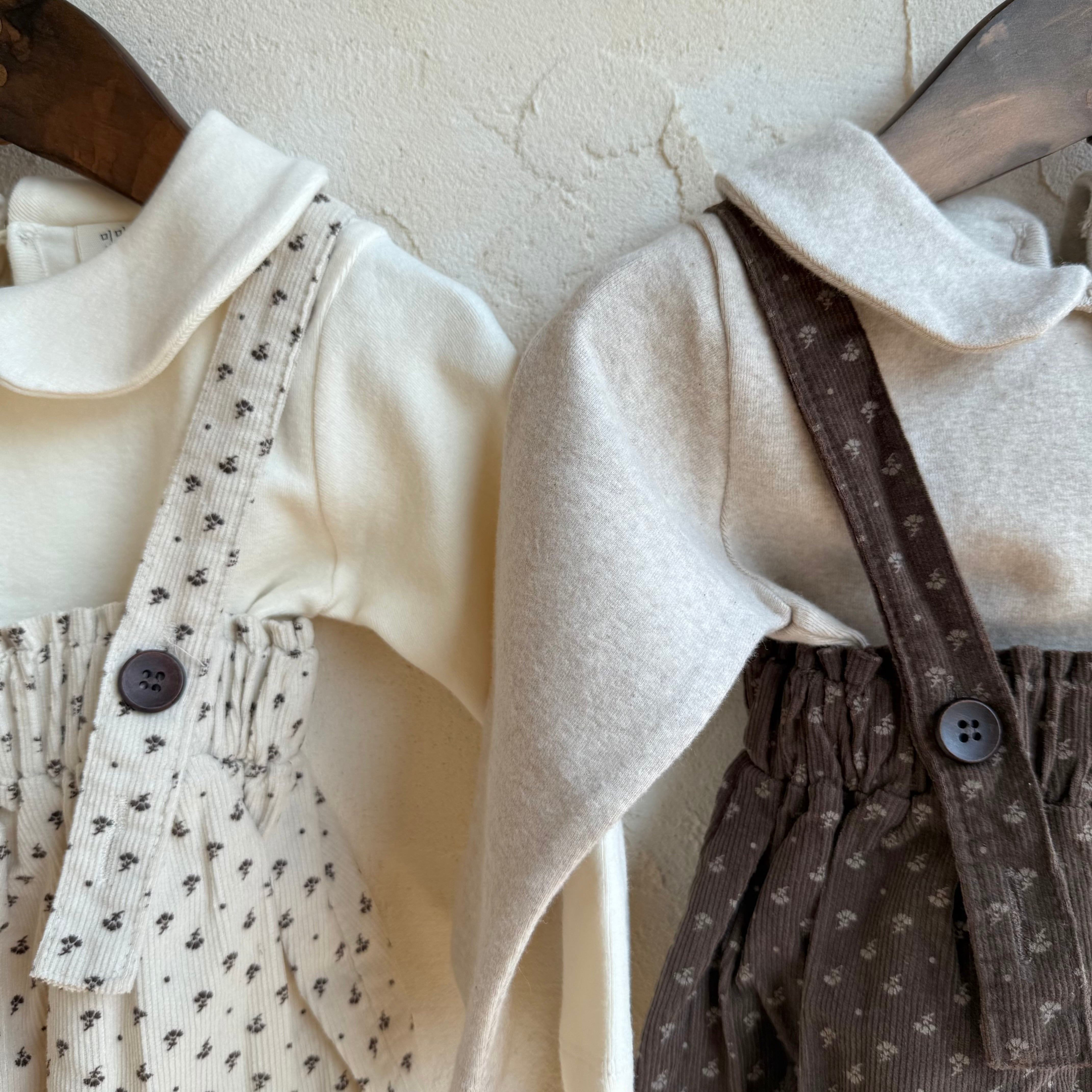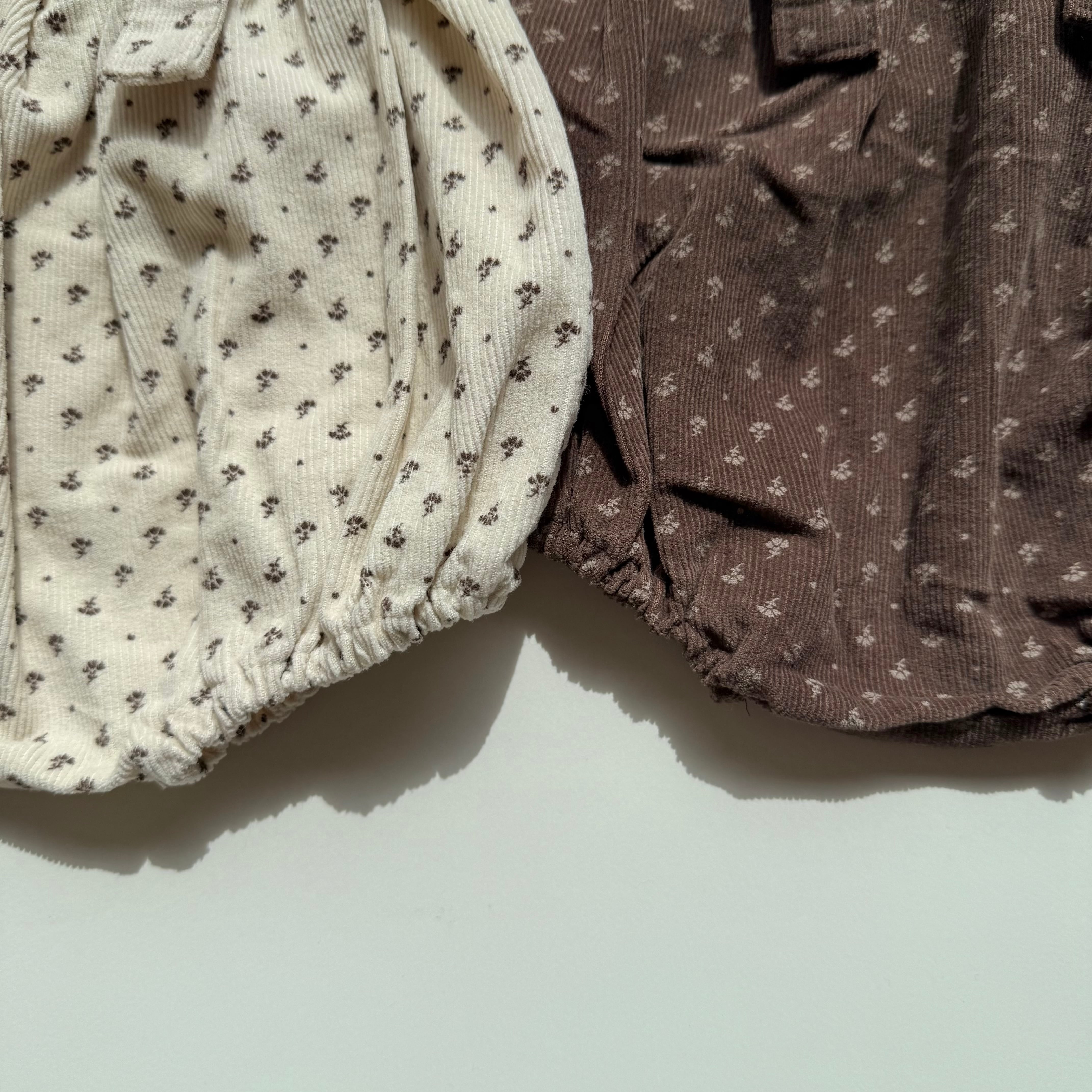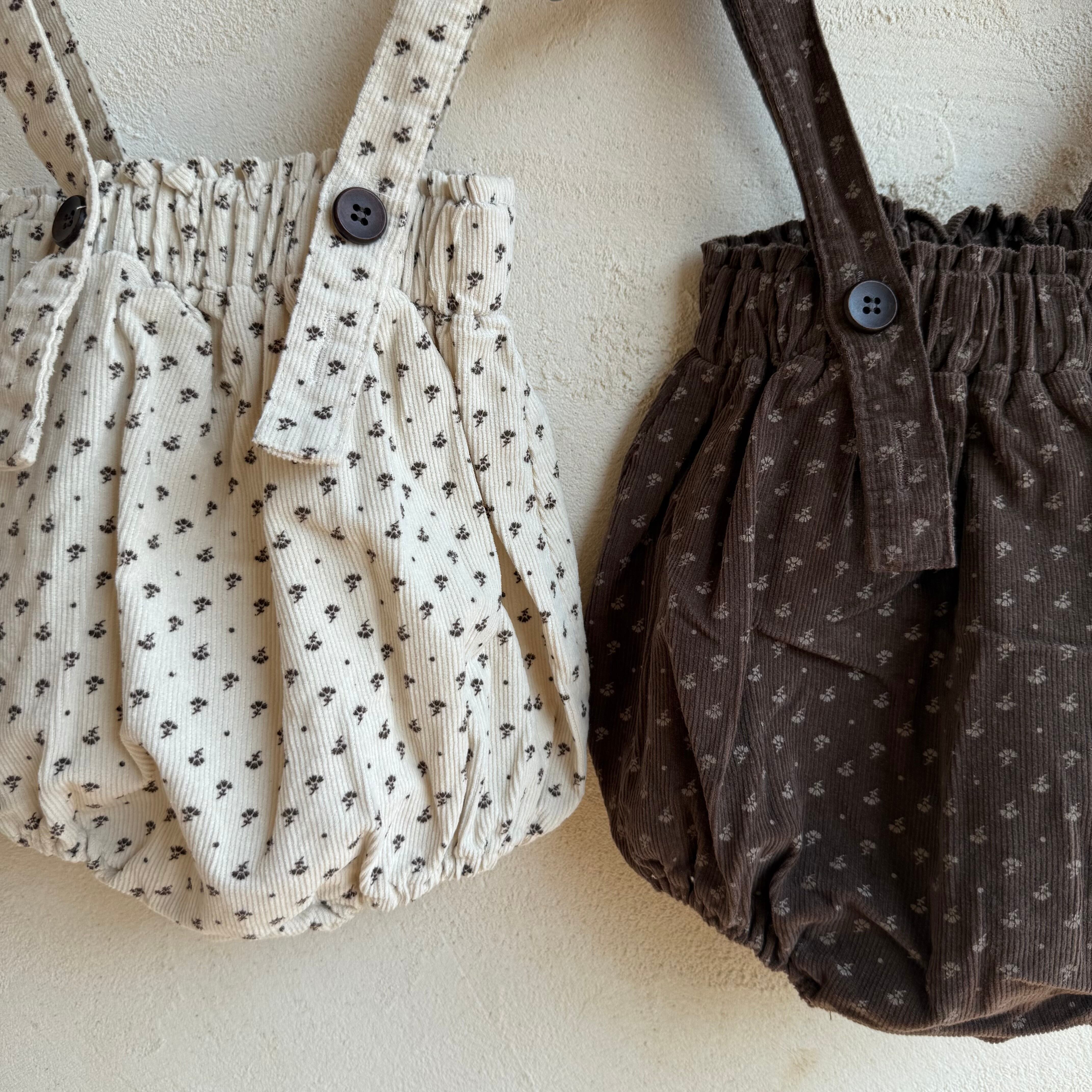 花柄のコードュロイ素材のサスペンダーブルマ。 丸みのあるシルエットが可愛らしい1枚。