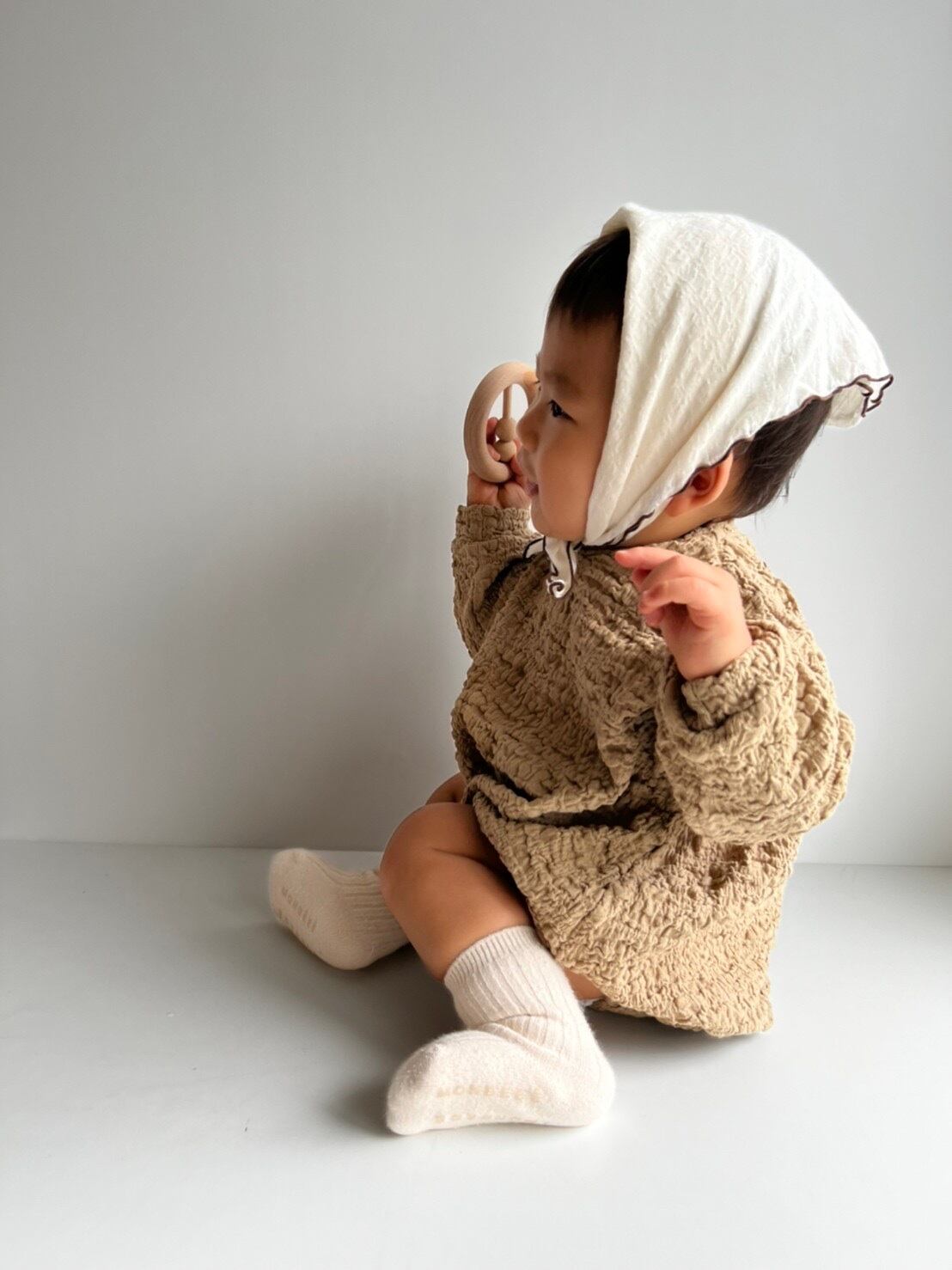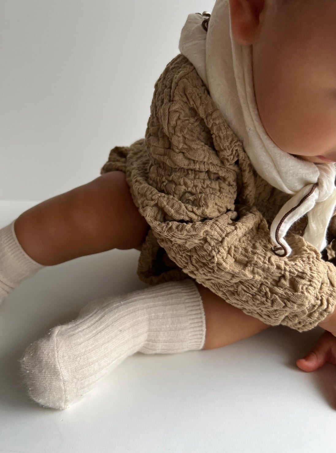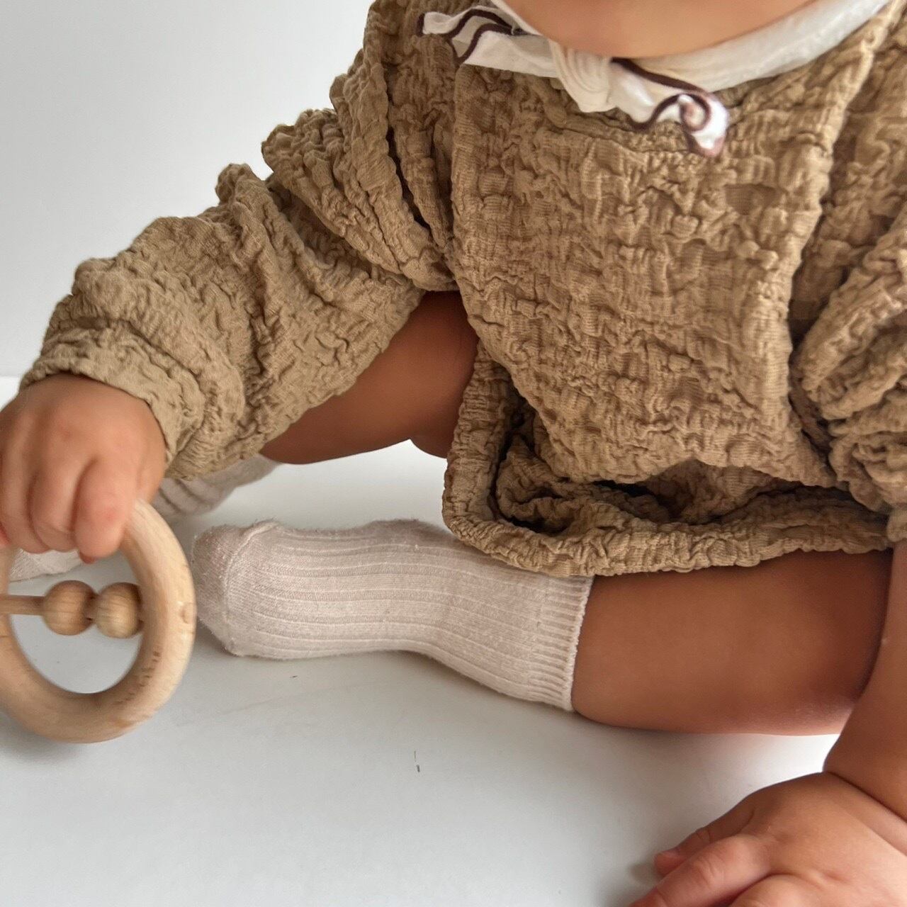 くしゅくしゅした素材のロンパース。